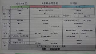 授業関連 2学期中間考査始まる 10月14日(火) 今日から金曜日まで4日間の日程で中間考査がスタートしました。自彊祭も終わり、一段落。3連休は気持ちを切り替えてしっかり準備ができましたかね? 2025.10.14 授業関連教務課津商ライフ1年団2年団3年団