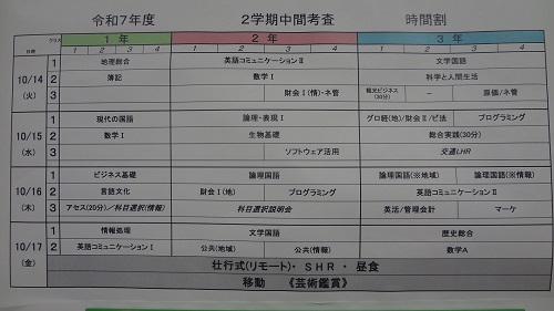 2学期中間考査始まる 授業関連 2025.10.14 10月14日(火) 今日から金曜日まで4日間の日程で中間考査がスタートしました。自彊祭も終わり、一段落。3連休は気持ちを切り替えてしっかり準備ができましたかね?