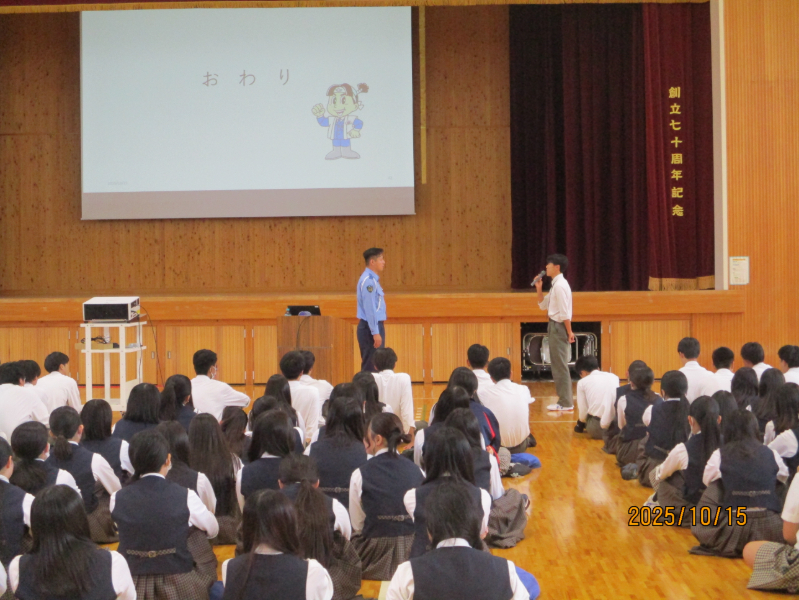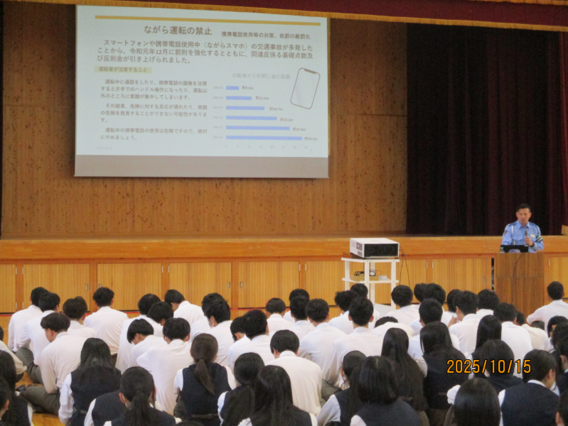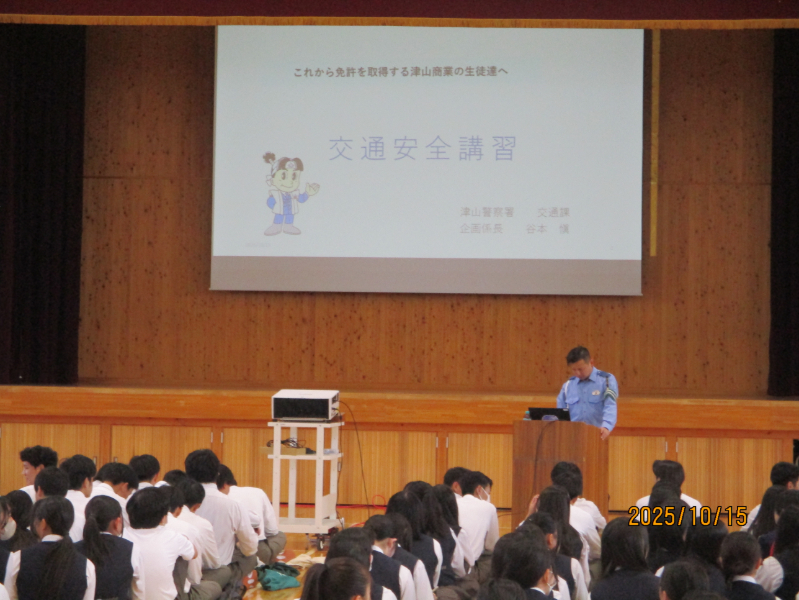 津山警察署交通課 谷本様をお招きし、3年生を対象に交通LHRを実施しました。今年で普通自動車免許を取得できる18歳を迎える3年生に向けて、若者に多い事故の形態や岡山県内の事故件数、事故を防ぐための注意点、自動車運転の危険性などをお話しいただきました。事故を起こさない、事故に遭わないためにも、今回お話いただいた内容をしっかり理解し、免許取得、そして本校卒業後の自動車運転を行ってほしいと思います。
