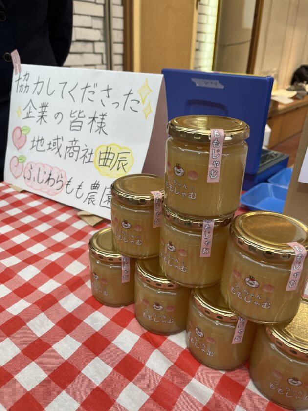 規格外の桃をどうにかできないか、、、ということで3年生が考え、「地域商社つやまエリア株式会社 曲辰」さんと「ふじわらもも農園」さんにご協力いただき、ももじゃむを作りました。