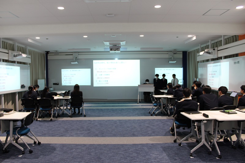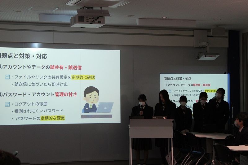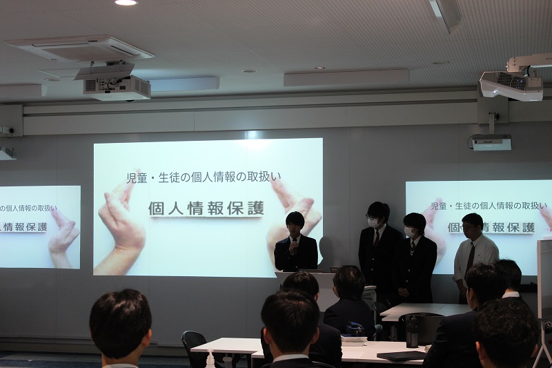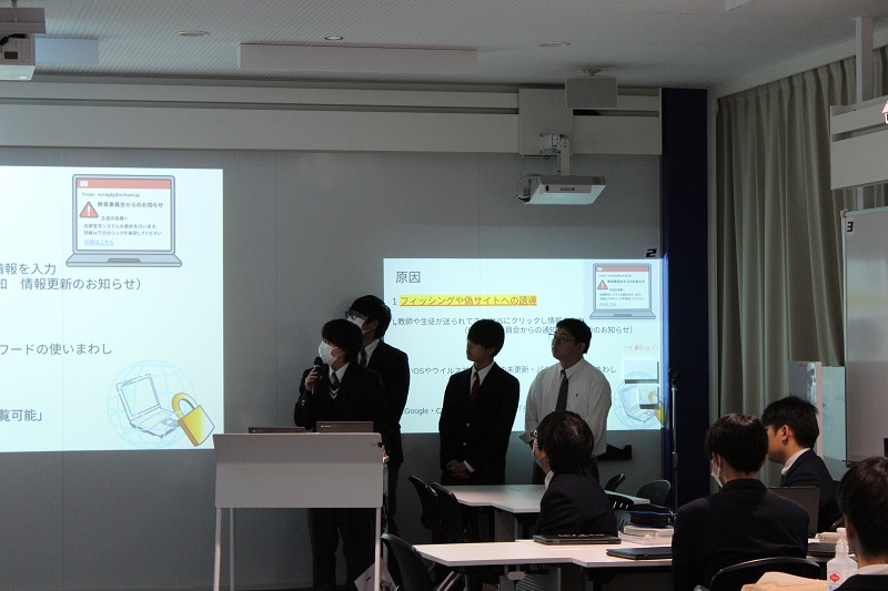 ネットワーク管理で生徒が教員対象の講習会を実施しました! 商業科 2025.11.19 11月17日(月)、18日(火) 3年生選択授業のネットワーク管理で教員対象の講習会を生徒が実施しました。講演会の内容は、ICTや情報技術が発展している今だからこそ必要な知識やセキュリティについてでした。この授業ではIPA主催のセキュリティマネジメント試験合格に向けて授業を進めていますが、社会に出てもその知識を使えるように様々な取り組みを行っています。