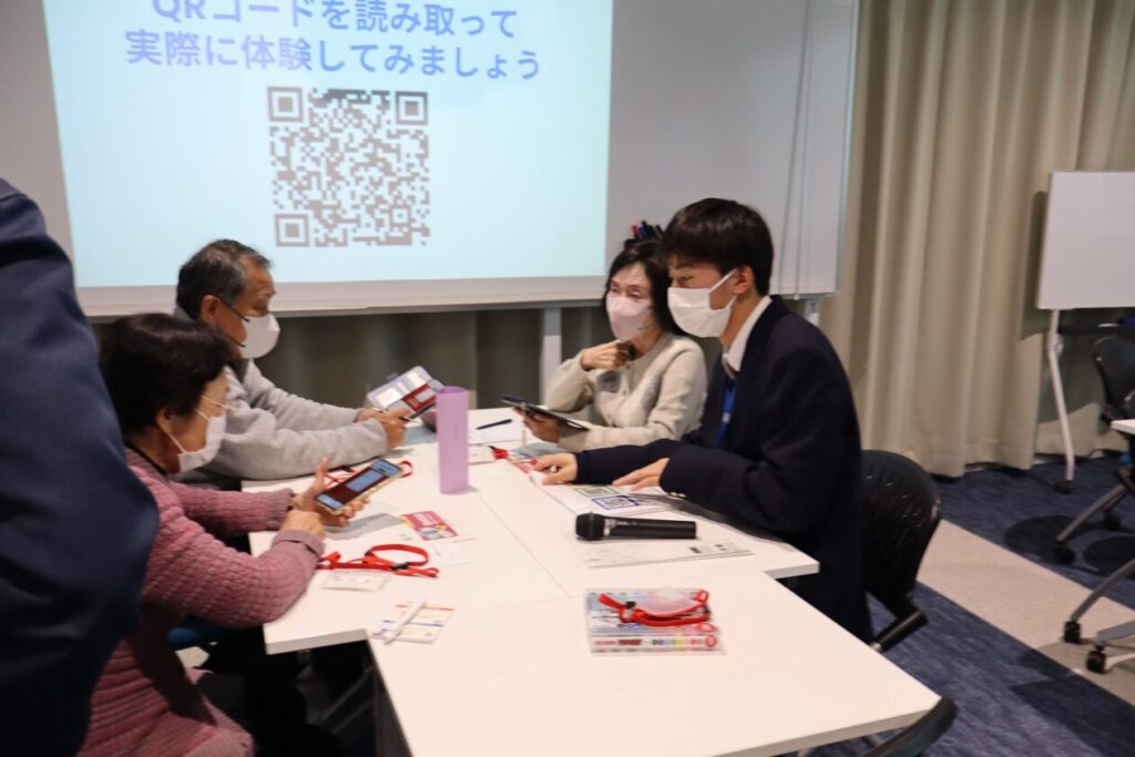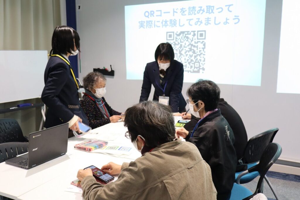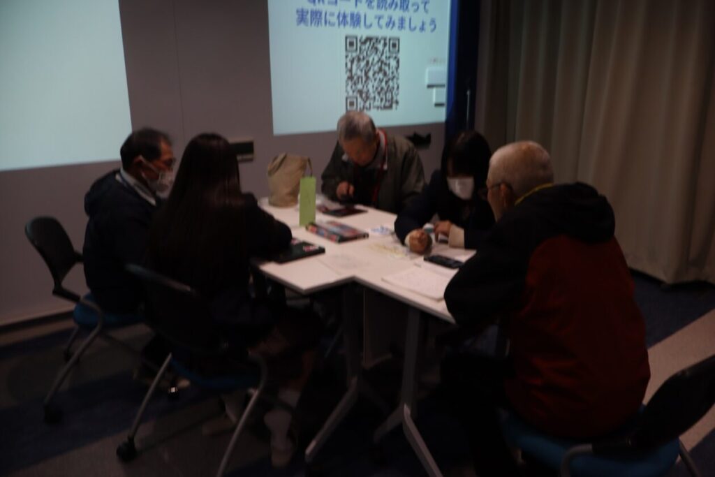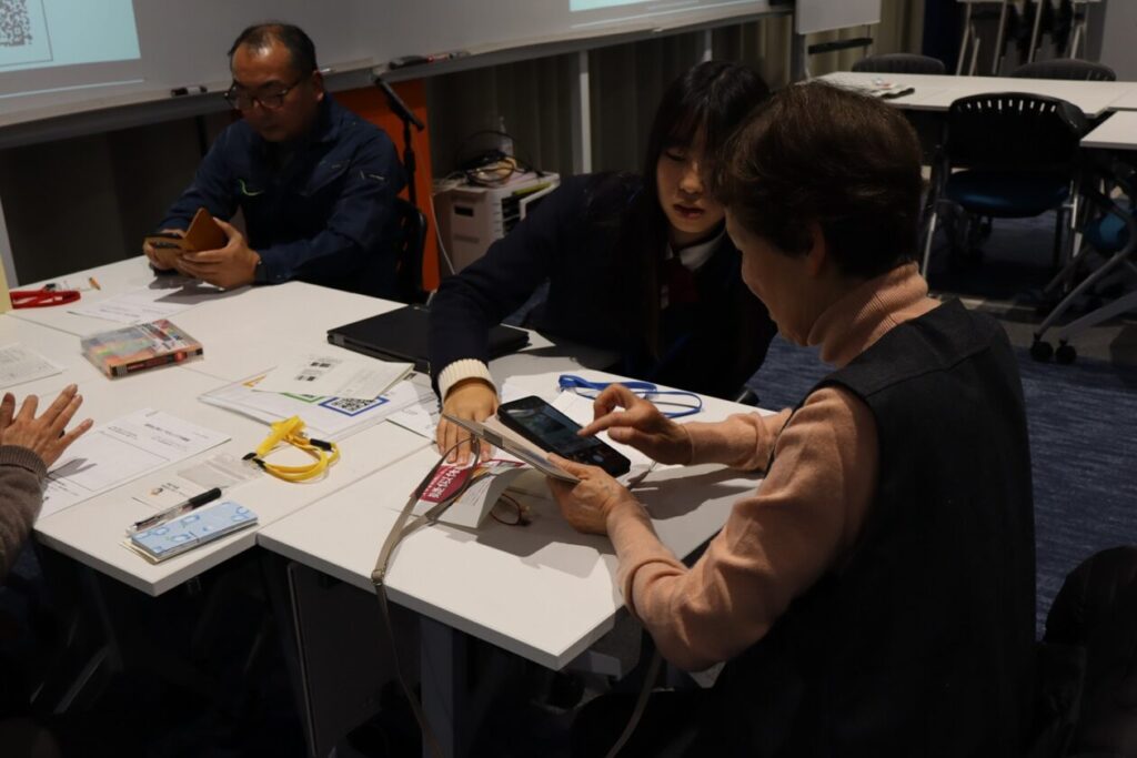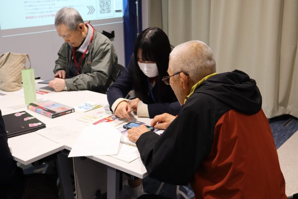 生徒達は各班に分かれ、地域の方にスマホ利用で脅威となる「フィッシング詐欺」、「ワンクリック詐欺」、「ランサムウェア」について分かりやすくまとめてお話ししました。その後、LINEアプリの使い方など地域の方に寄り添ってスマホのお悩みを解決していました。