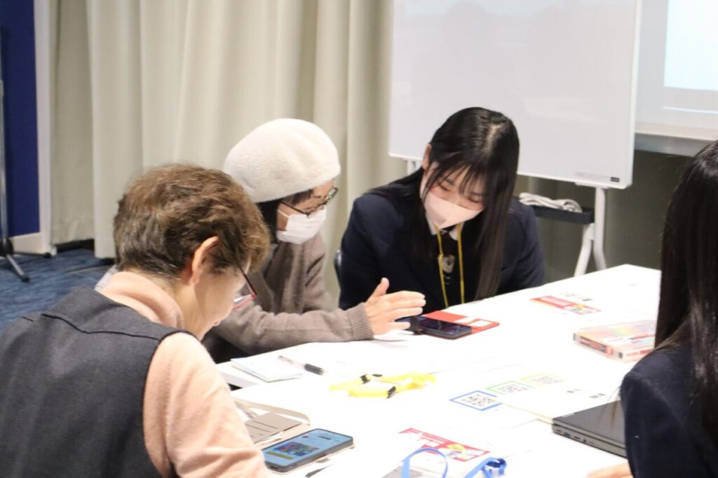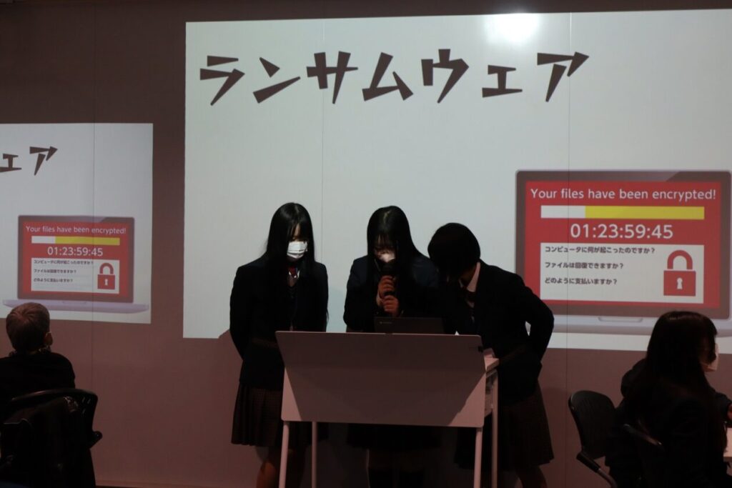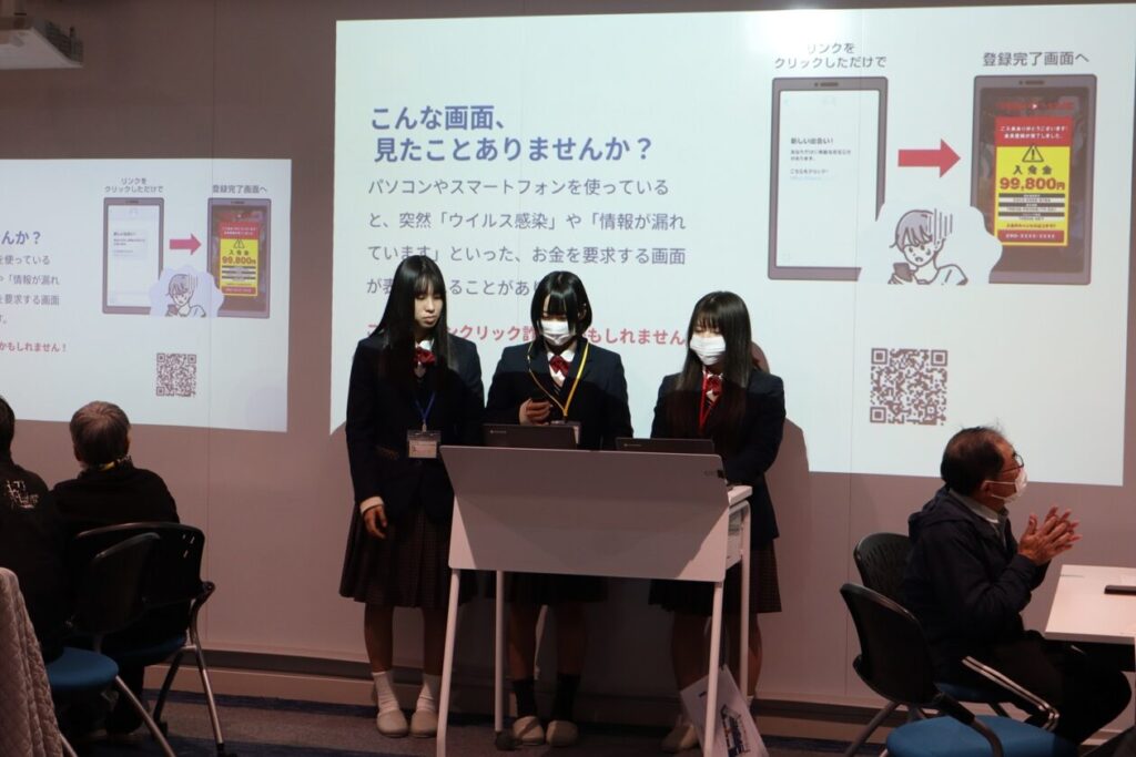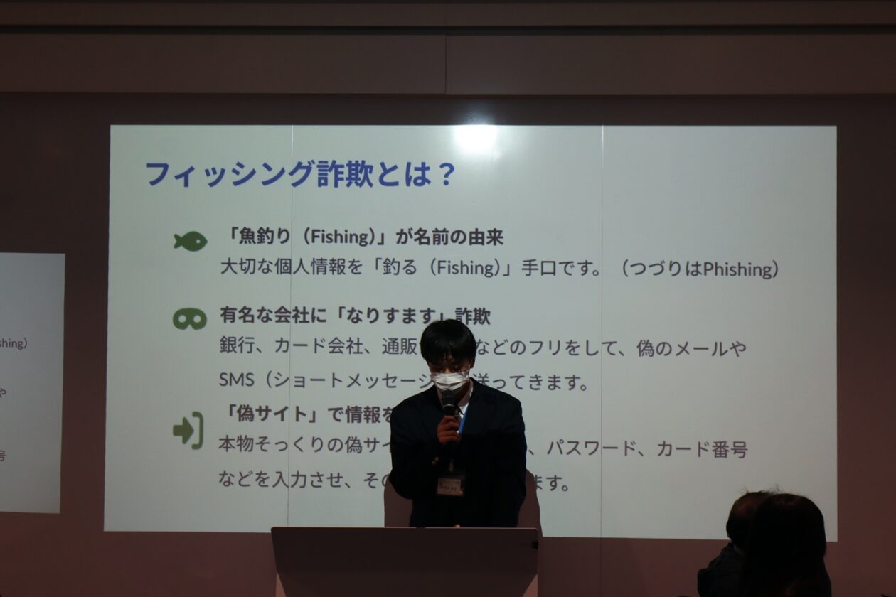 生徒達は各班に分かれ、地域の方にスマホ利用で脅威となる「フィッシング詐欺」、「ワンクリック詐欺」、「ランサムウェア」について分かりやすくまとめてお話ししました。その後、LINEアプリの使い方など地域の方に寄り添ってスマホのお悩みを解決していました。