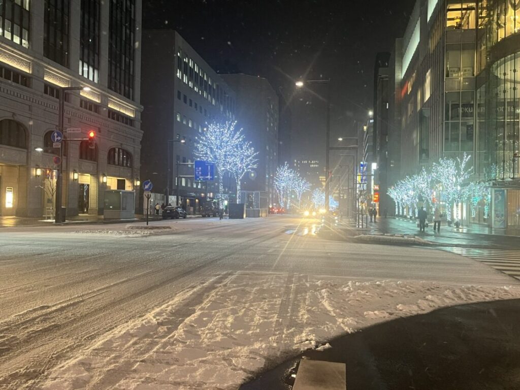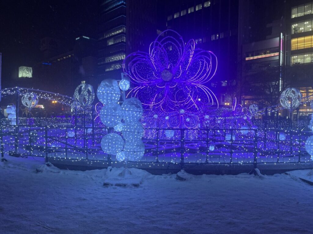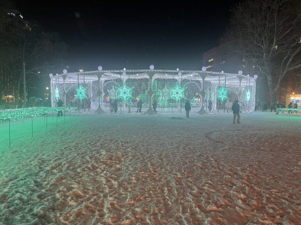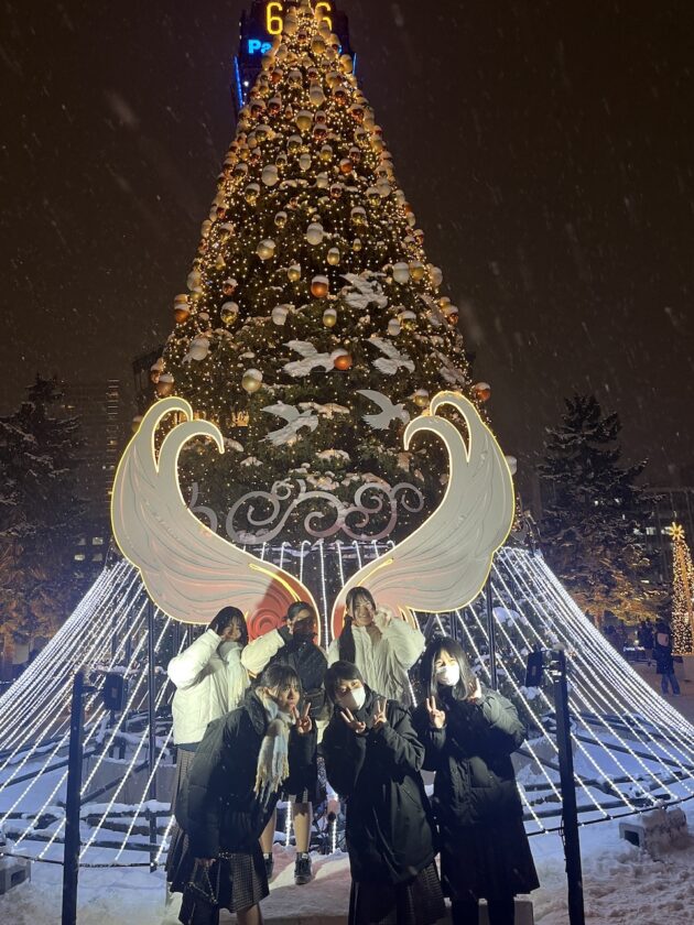 修学旅行一日目③(北海道方面) 学校行事 2025.12.10 ホテルに到着後、全員で地下鉄を利用して「さっぽろホワイトイルミネーション」の鑑賞をしました。雪とイルミネーションの幻想的な景色は、岡山ではなかなか体験できません。ツリーやオブジェの前でそれぞれ記念撮影を楽しみました。