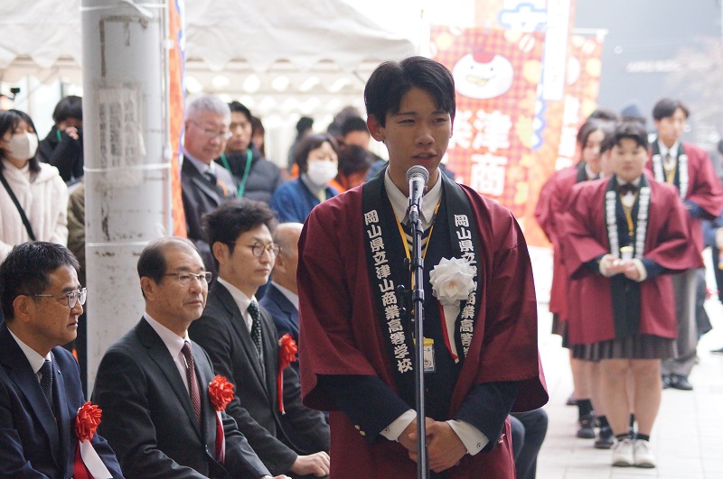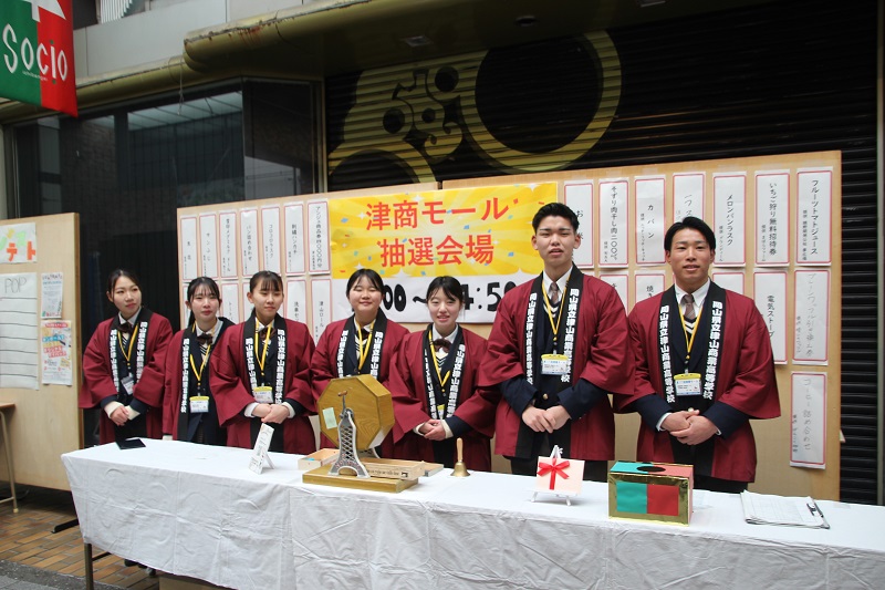 第17回津商モールから(運営側の様子) 地域連携 2026.01.08 津商モールの影の立役者をご紹介します。課題研究で津商モールを選択し、津商モールを統括する精鋭です。社長、副社長を筆頭に仕入課、販売課、広報課、経理課の中心となって活躍しています。当日は店頭に立つことはありませんが、滞りなく1日が終えられるよう、駆け抜けました!