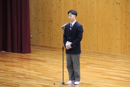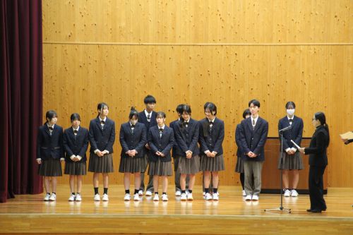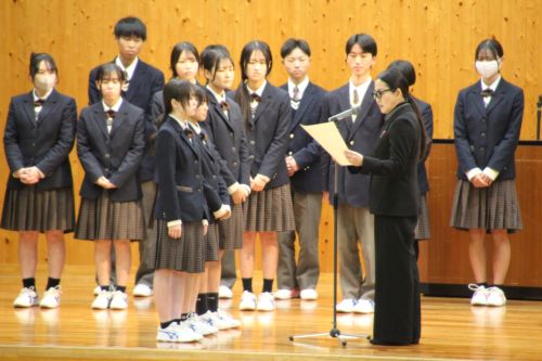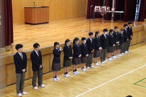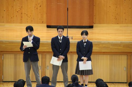今日は生徒会新執行部の紹介から始まり、表彰伝達式、壮行式、津商モール報告会、終業式、各課・科からの諸連絡となりました。
