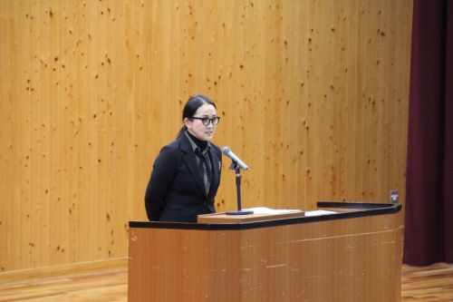 終業式の式辞で弘中校長は「『誰かの喜ぶ顔が見たくて』との津山商業としての目標を叶えるために、2学期は津商モールや孫心弁当など、地域の方々に喜んでいただき長く継続してきた行事があった。このような活動を通し、目に見えない価値を大切にし、相手のことを考えた行動を取れたことは素晴らしかった。そして相手がやってくれたことに目を向けることがこういった行動の礎になっている。今年の自分より成長する来年にするための冬休みにして欲しい。」と述べました。