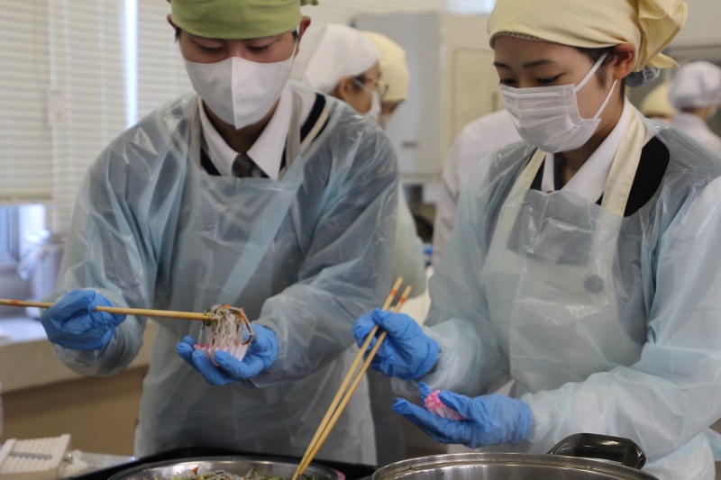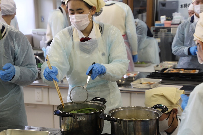 生徒は経験したことのない食数を作ることに、はじめは不安そうな面持ちでしたが、おいしそうな弁当が完成すると笑みがこぼれ、笑顔で高齢者の方にお届けすることができました。