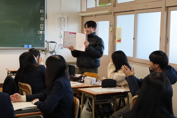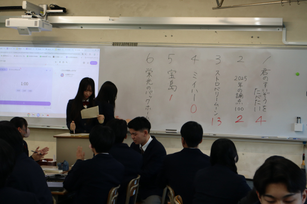 図書LHR「ビブリオ・バトル」 図書委員会 2026.01.16 各学年各クラスのLHRで図書委員を中心にビブリオバトルを行いました。ビブリオバトルとは、おすすめの本を持ち寄り、紹介し合い、参加者全員で「一番読みたくなった本(チャンプ本)」を投票で決めるコミュニケーションゲームです。 各クラスで5人程度のグループを作り、紹介をしあい、その後、各クラスのチャンプ本を決めました。各クラスのチャンプ本を図書委員会のたより等で紹介しますのでお楽しみに。