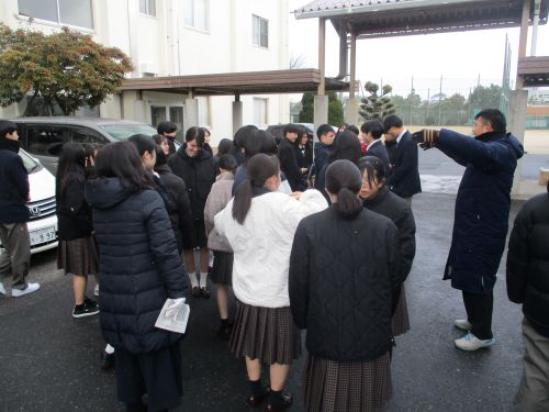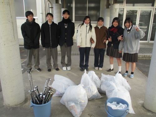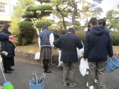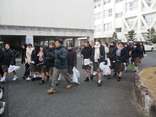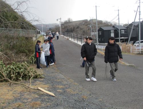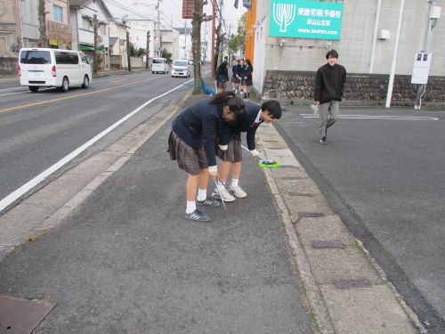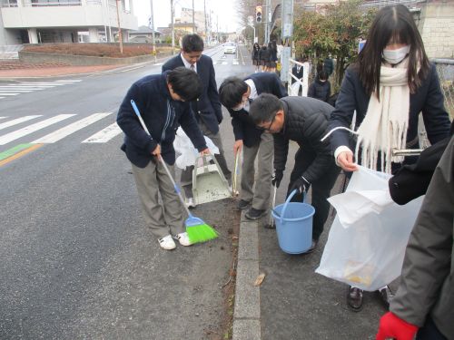 1年生地域清掃活動 ボランティア活動 2026.01.23 1月21日(水) 小雪が舞う中、クラスごとに分担を決め、学校周辺地域の清掃活動を行いました。とても寒い中での活動となりましたが、積極的に取り組めました。