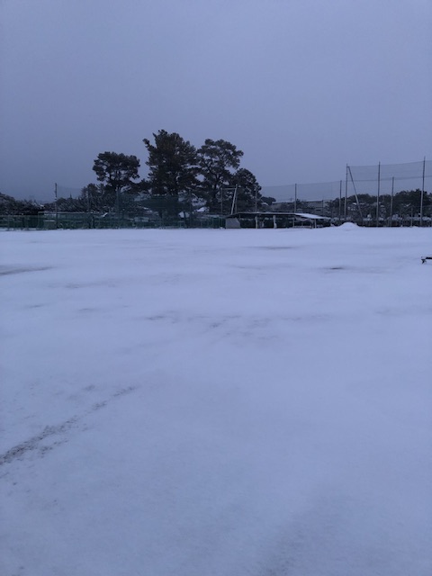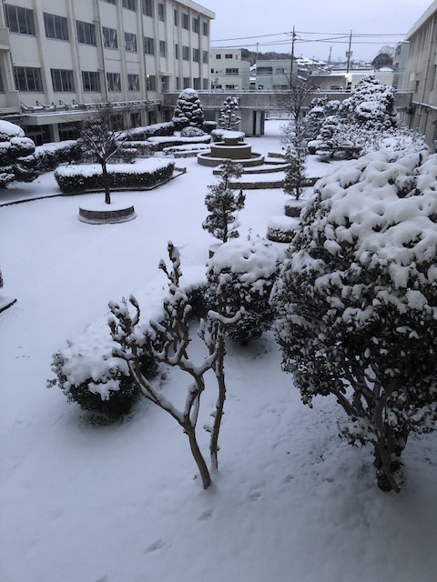 昨日からの雪が積もり、グラウンドも中庭も真っ白に。