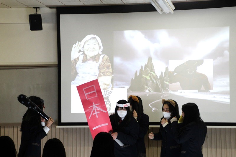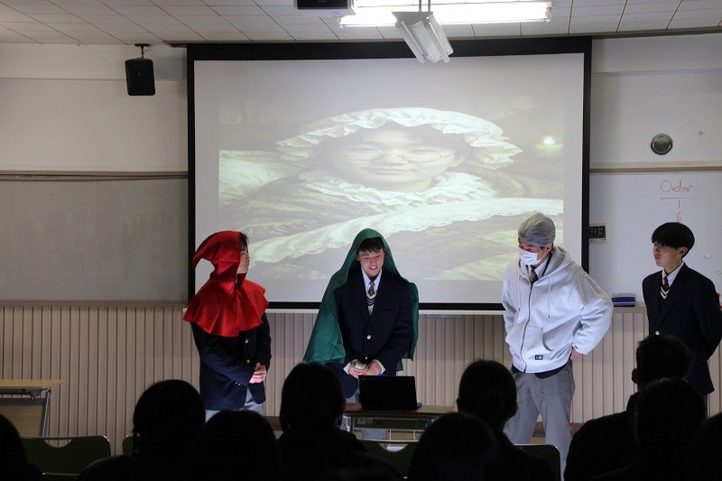 2年生の論理表現Ⅰ(ノーラン先生とのTT)の授業で、3学期の一大プロジェクトとして、スキットパフォーマンス(寸劇)に取り組みました。各クラス4・5人のグループに分かれ、寸劇のタイトル、スクリプト、背景を考え、小道具を作成し、セリフを覚え本番に挑みました。