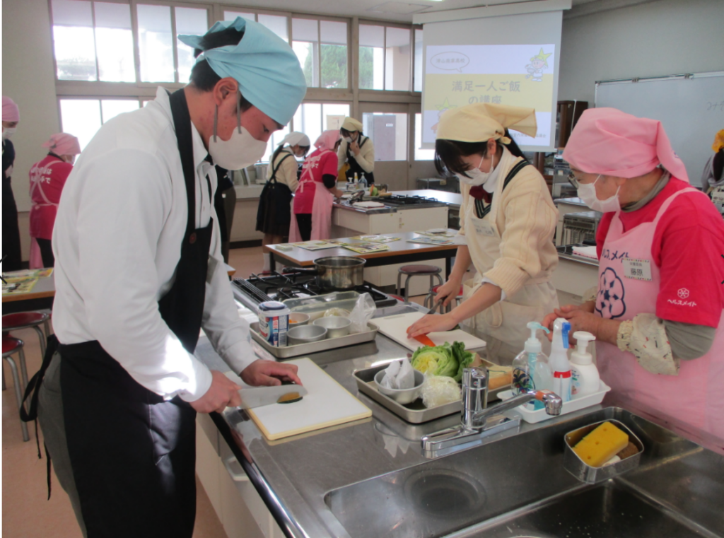 卒業間近となった3年生の希望者を対象に、満足一人ご飯の講座を開催しました。この講座は高校生への食育事業の一環として美作保健所が行っている活動で、本校でも数年に一度開催しています。
