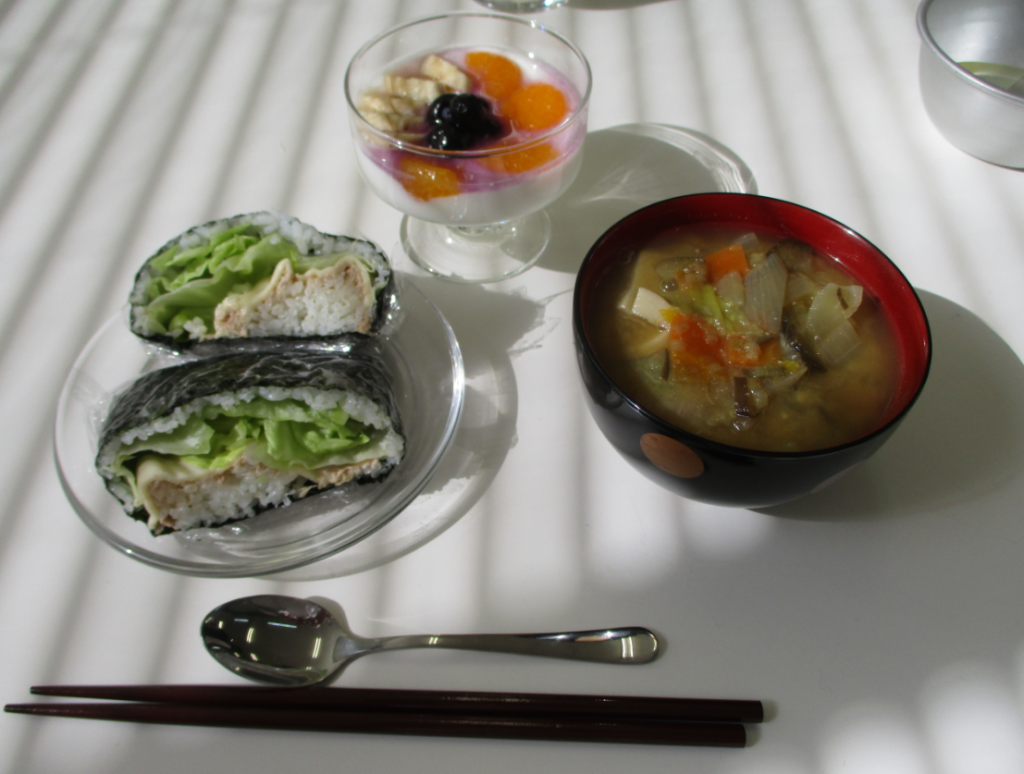 献立はおにぎらず、野菜たっぷりみそ汁、フルーツヨーグルトです。