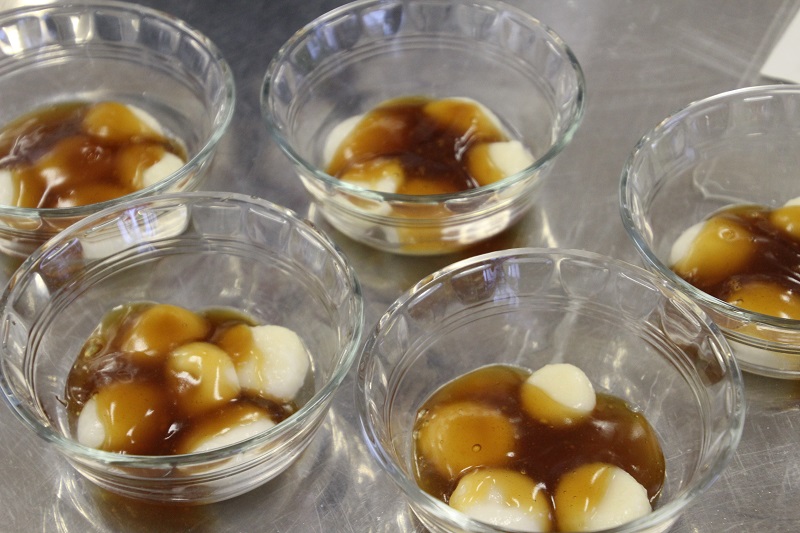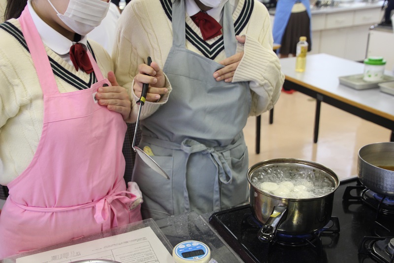 2年生調理実習 授業関連 2026.02.20 2年生が調理実習でみたらし団子を作りました。 今回は白玉粉に水を加えて作る通常Var.と、豆腐を入れて作る豆腐Var.の2種類を作り、味や食感を比較しました。 ユニークな形の団子を作ったり、みたらしのタレ作りでは、加熱していると急にとろみが付く様子に驚いたりしながら、楽しく調理をすることができました。 来年度、3年生になったら調理実習もレベルアップしていきます。一人でも調理ができるよう、知識や技術を身につけていきましょう。