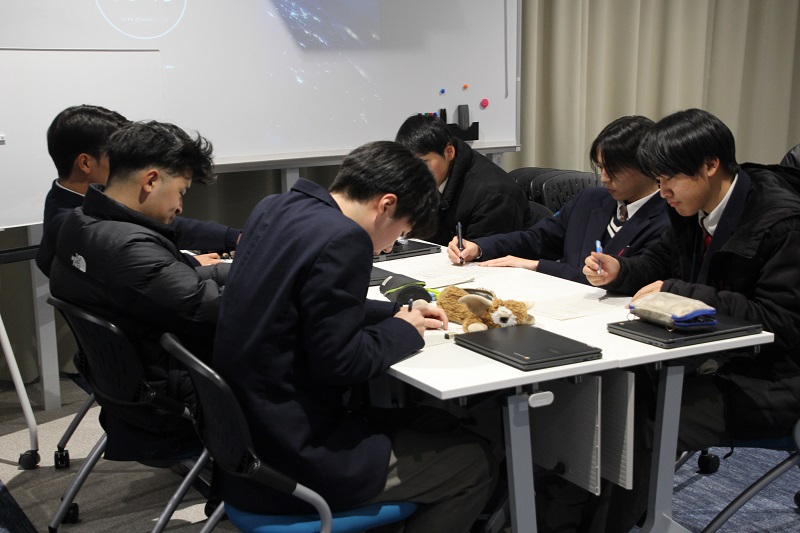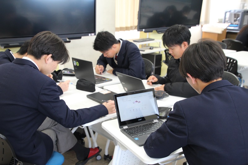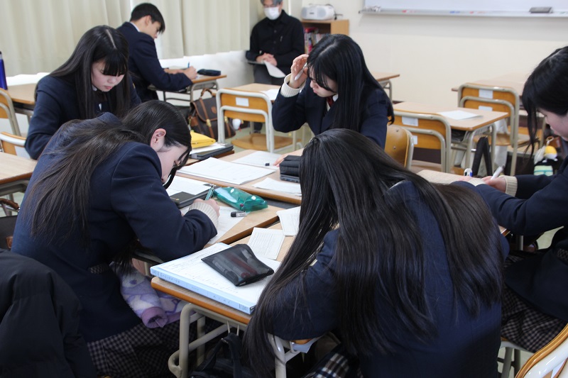 1年間の総合的な探究の時間も今日が最終回となりました。1年生や2年生を対象に各班それぞれ発表を聞いた感想も、各グループに手渡され熱心に見入っていました。それも踏まえ、今年度一年間の取り組みを個人個人やグループで振り返りをしました。