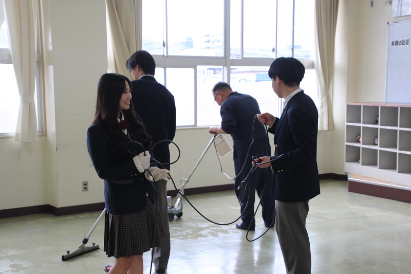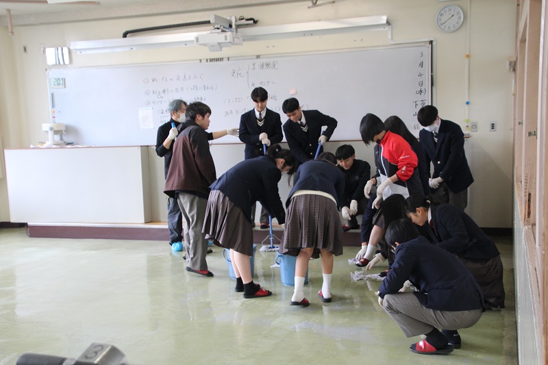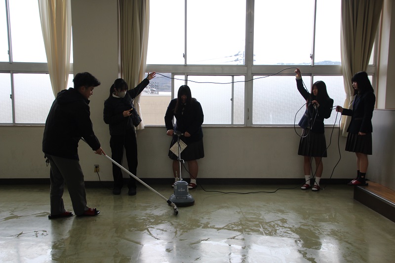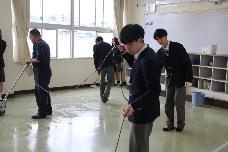 ワックスがけをしました(2年生) 保健厚生課 2026.03.06 3月4日(水) 特別時間割を終えた午後、2年生が各ホームルームをワックスがけしました。机の脚のほこりを取り除き、机の搬出をしました。使い慣れないポリッシャーやバキュームを巧みに使いこなす2年生で、手際よく作業を終えました。