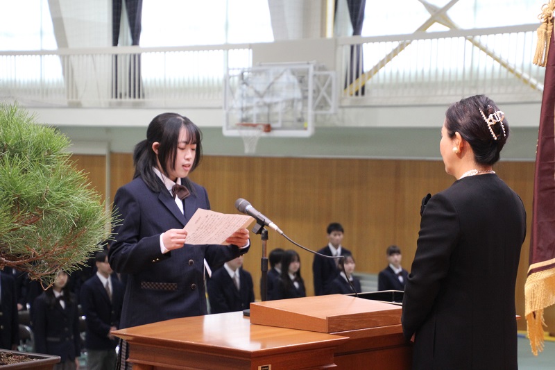 新入生を代表し、兼光紗那さんが「大きな期待と夢を胸に津山商業に入学しました。社会に貢献できる人にされるよう精一杯頑張りたい」と決意を述べました。